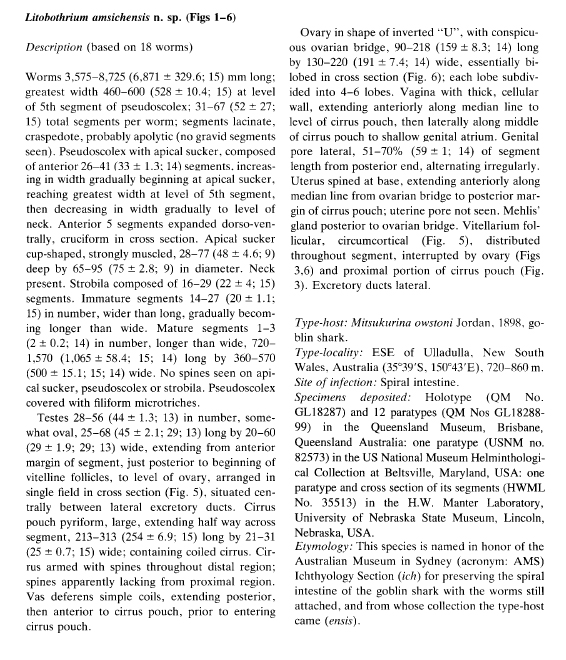 Olson, P. D. and J. N. Caira. 2001. Two new species of Litobothrium Dailey, 1969 (Cestoda: Litobothriidea) from thresher sharks in the Gulf of California, Mexico, with redescriptions of two species in the genus. Systematic Parasitology 48: 159-177. (4514) Download PDF |