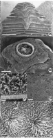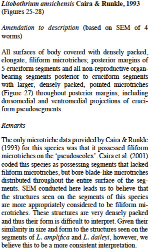 L. amsichensis Figures 25-28. 25. Scolex of L. amsichensis. 26. Apex of scolex showing first, cruciform pseudosegment and opening of apical sucker. 27. Large microtriches on border of third cruciform pseudosegment. 28. Densely packed filiform microtriches on terminal segment of strobila. Scale-bars: 17, 500µm; 18-19, 23-24, 27-28, 1 µm; 20, 50 µm; 21-22, 26, 20 µm; 25, 100 µm.