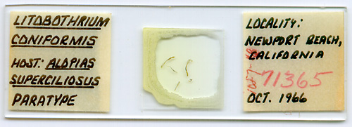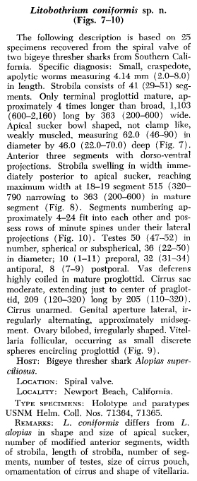Dailey, M. D. 1969. Litobothrium alopias and L. coniformis, two new cestodes representing a new order from elasmobranch fishes. Proceedings of the Helminthological Society of Washington 36: 218-224. (152) Download PDF |