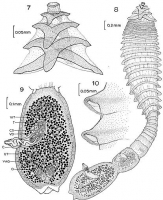 FIGURES 7-10. Litobothrium coniformis n. sp. 7. Anterior end of specimen showing apical sucker and modified segments. 8. Strobilate worm. 9. Mature terminal proglottid. 10. Minute spines found under lateral projections of segments 4-24.
