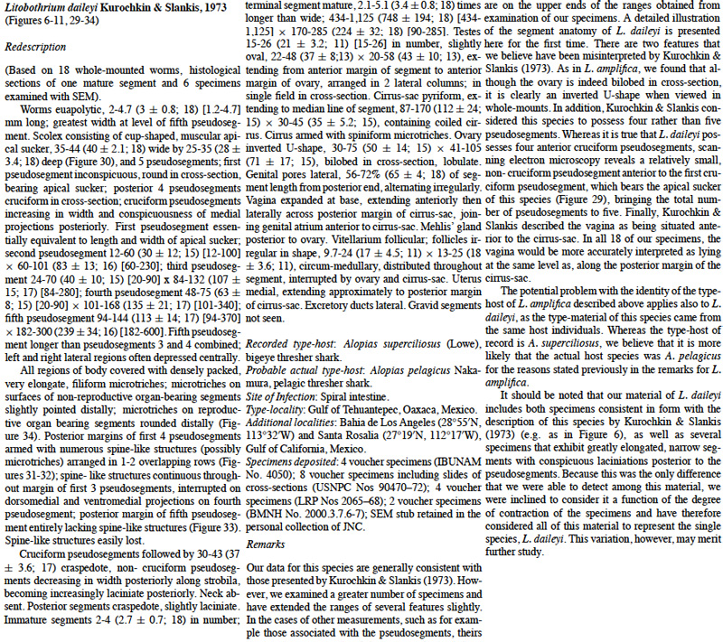 Olson, P. D. and J. N. Caira. 2001. Two new species of Litobothrium Dailey, 1969 (Cestoda: Litobothriidea) from thresher sharks in the Gulf of California, Mexico, with redescriptions of two species in the genus. Systematic Parasitology 48: 159-177. (4514) Download PDF |