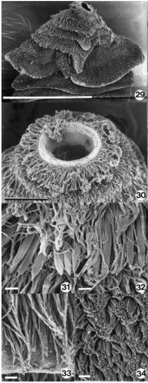 Figures 29-41. Scanning electron micrographs of Litobothrium daileyi (Figures 29-34). 29. Scolex of L. daileyi. 30. Apex of scolex showing first non-cruciform pseudosegment and opening of apical sucker. 31. Spine-like structures on posterior margin of first pseudosegment. 32. Spine-like structures on posterior margin of third pseudosegment. 33. Posterior margin of fifth pseudosegment (note lack of spine-like structures). 34. Densely packed filiform microtriches on terminal segment of strobila.
