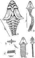 FIGURES A-F. Litobothrium daileyi n. sp. A. Psudoscolex. B. Entire young tapeworm. C. Spines on the posterior margins of the first 3 segments. D-F. Psudoscolex in 3 projections: D. apically; E. ventrally; F. laterally. [figure caption in Russian]