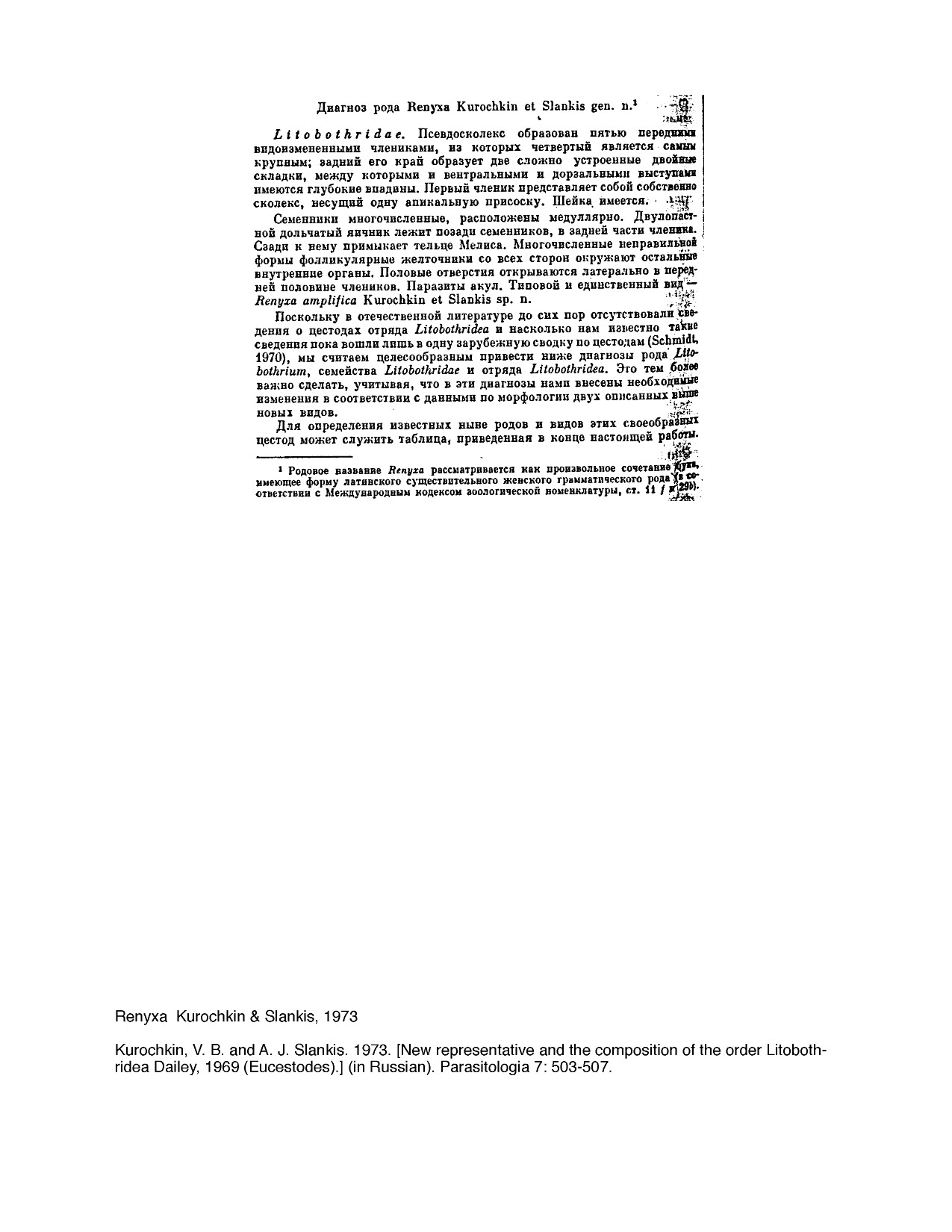 Kurochkin, V. B. and A. J. Slankis. 1973. [New representative and the composition of the order Litobothridea Dailey, 1969 (Eucestodes).] (in Russian). Parasitologia 7: 503-507.