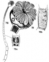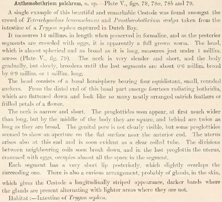 FIGURES 78 & 79. Anthemobothrium pulchrum n. sp. 78. Anthemobothrium pulchrum. x 8. a. Proglottis from middle. b. Proglottis from end of body. 79. Head of the same. x 40.