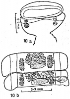 FIGURE 10. Cephalobothrium gymnurai n. sp. a. Scolex. b. Mature proglottids.