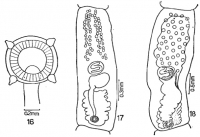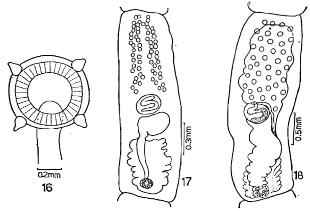 FIGURES 16-18. Cephalobothrium longisegmentum n. sp. [16. Scolex. 17. Mature segment. 18. Gravid segment]
