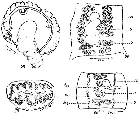 FIGURES 93-96. Cephalobothrium rhinobatidis n. sp. 93. Scolex with anterior sucker everted, posterior view. 94. Scolex with anterior sucker retracted, front view. 95. Immmature segment. 96. Female mature segment.