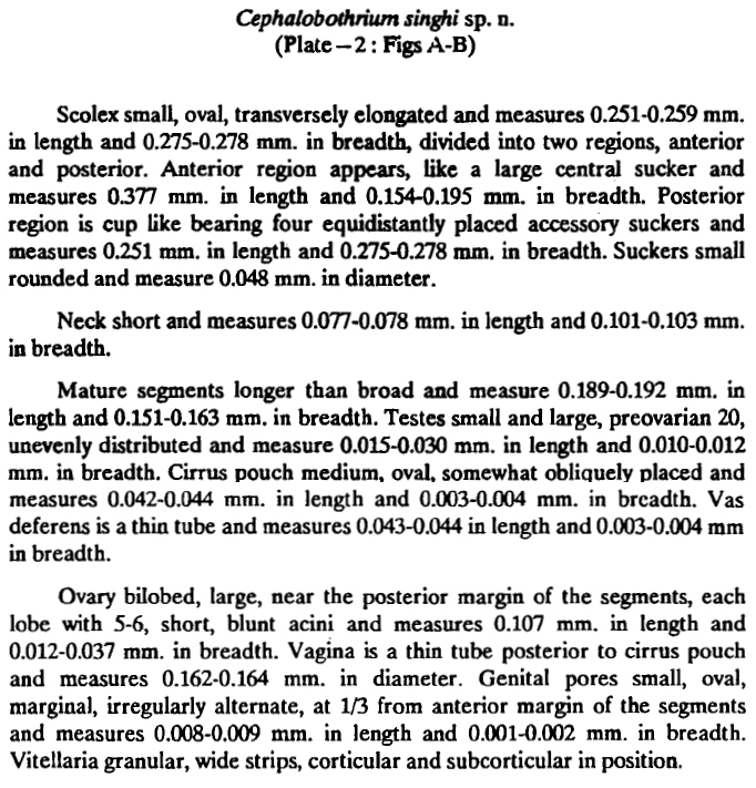 PLATE 2. FIGURES A & B. Cephalobothrium singhi n. sp.