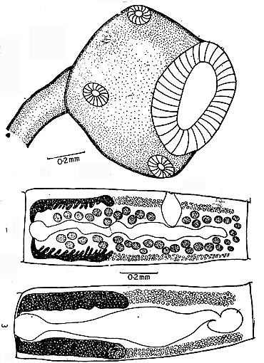 FIGURES 1-3. Cephalobothrium stegostomi n. sp. 1. Scolex. 2. Mature proglottid. 3. Gravid proglottid.