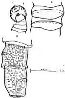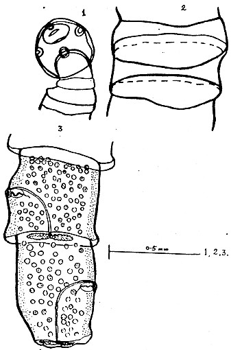 FIGURES 1-3. Cephalobothrium trygoni n. sp. 1. Scolex. 2. Arrangement segments. 3. Mature segments.