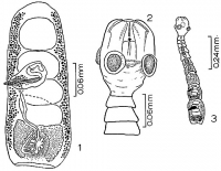 FIGURES 1-3. Discobothrium caribbensis n. sp. 1. Mature segment. 2. Scolex. 3. Entire worm.