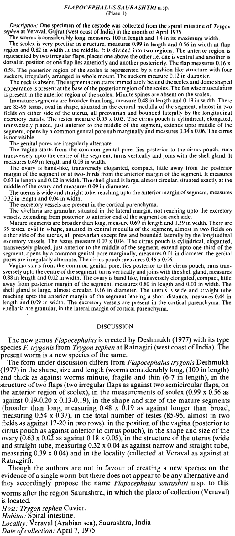 Shinde, G. B. and R. A. Deshmukh. 1979. On a new species of Flapocephalus Deshmukh R. A., 1977 (Cestoda: Lecanicephalidae Braun, 1900) from a marine fish at Veraval, west coast of India. Rivista di Parassitologia 40: 295-298. (412) Download PDF |