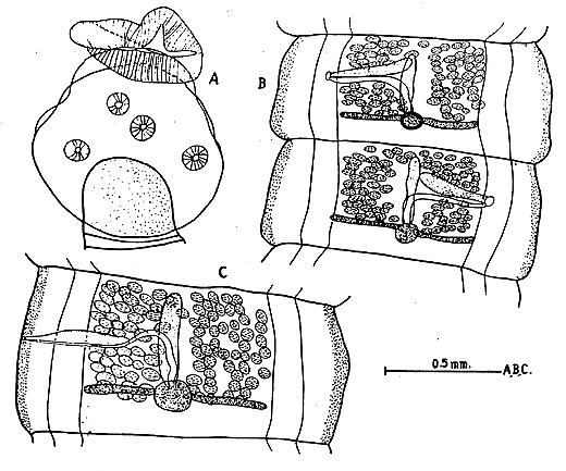PLATE 1. Flapocephalus saurashtri n. sp. A. Scolex. B. Immature segments. C. Mature segments.