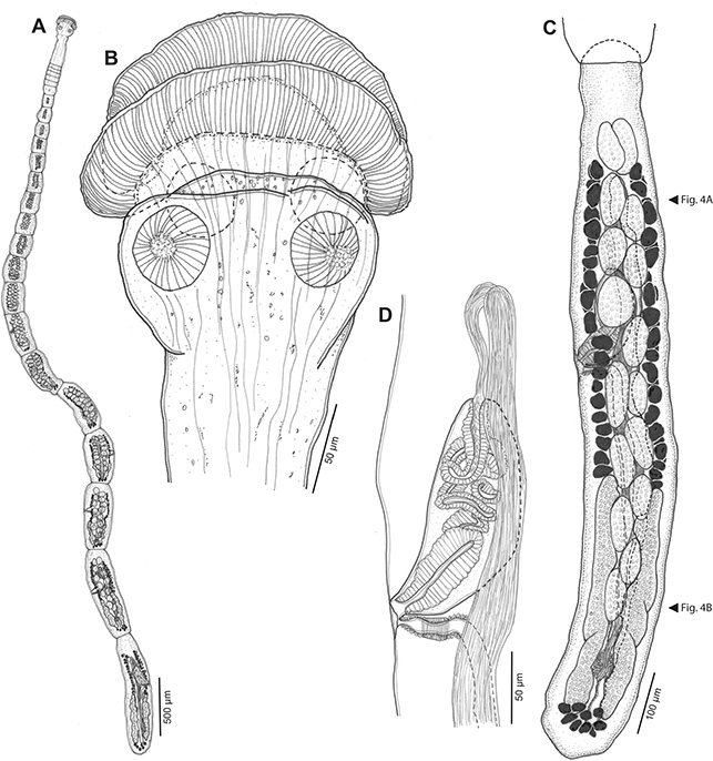 Voucher Material 1 voucher (mature worm, BRT-P 007); 6 vouchers (QM G241945–G241950); 8 vouchers (1 prgl cs, and 1 sc ls and voucher; USNM 1456344–1456351); 5 vouchers (LRP 11093–11097) and 1 SEM voucher (LRP 11098); 2 hologenophores (LRP 11099 and 11100); LRP 8302 (of Caira et al., 2014 as Flapocephalus n. sp. 1)