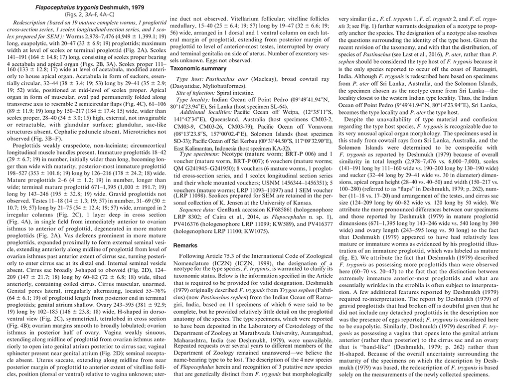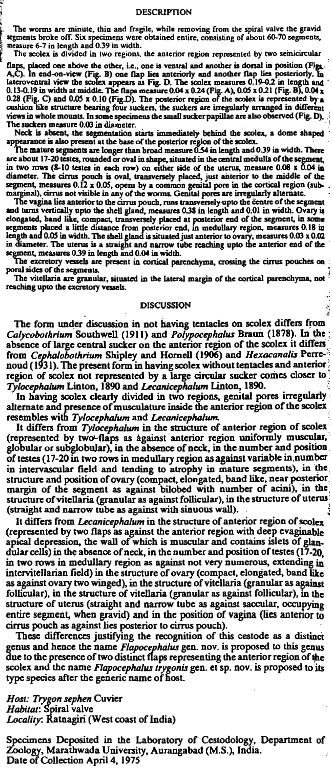 Deshmukh, R. A. 1979. On a new cestode Flapocephalus trygonis gen. et sp. nov. (Cestoda: Lecanicephalidae) from Trygon sephen from west coast of India. Rivista di Parassitologia 40: 261-265.