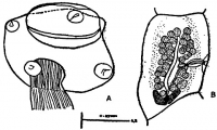 FIGURES A & B. Hexacanalis indirajii n. sp. A. Scolex. B. Mature segment.