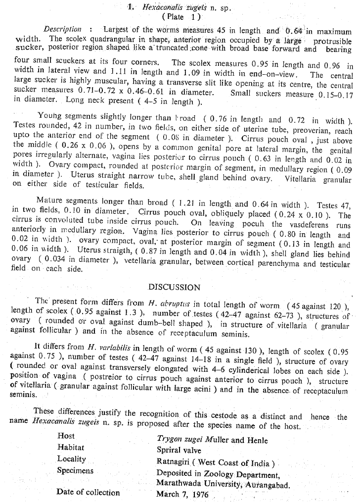 Shinde, G. B. and R. A. Deshmukh. 1979. On two new species of Hexacanalis Perrenoud, 1931 (Cestoda: Lecanicephalidae) from marin fishes. Marathwada University Journal of Science 18: 133-139. (3852) Download PDF |