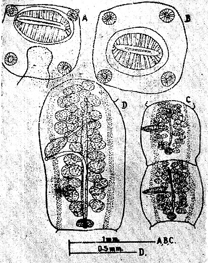 PLATE I. FIGURES A-D. Hexacanalis zugeis n. sp. A. Scolesx [sic] (Lateral view). B. Scolex (end -on -view). C. Young segments. D. Mature segment.