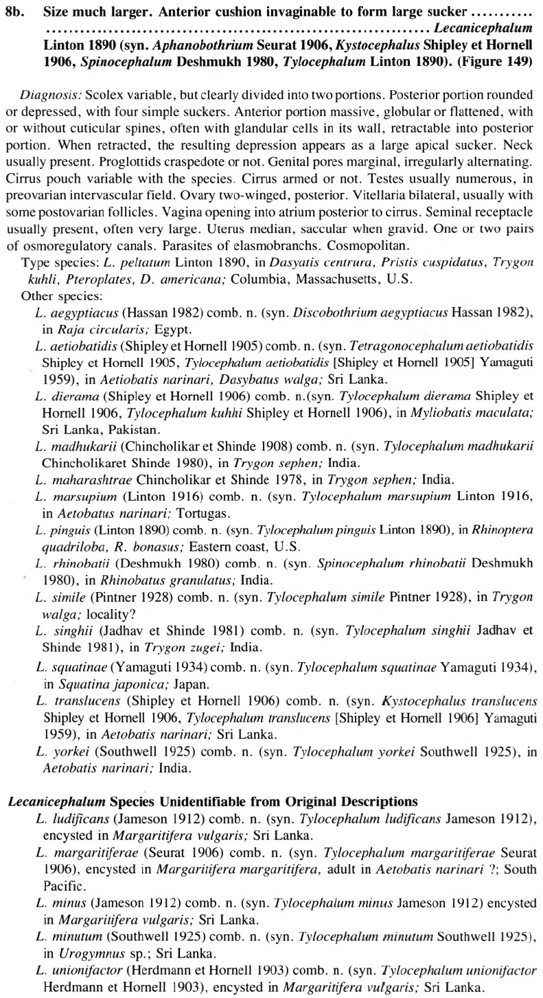 Shipley, A. E. and J. Hornell. 1906. Report on the cestode and nematode parasites from the marine fishes of Ceylon. Report to the Government of Ceylon on the Pearl Oyster Fisheries of the Gulf of Manaar (Herdman), Part 5 5: 43-96. (431) Download PDFSchmidt, G. D. 1986. Handbook of tapeworm identification. CRC Press, Boca Raton, Florida, 675 pp. (660) Download PDF |
