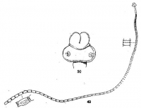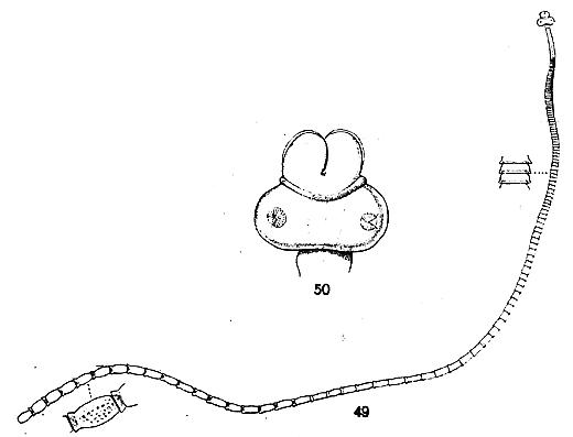 PLATE 3. FIGURES 49 & 50. Tylocephalum dierama n. sp. 49. Tylocephalum dierama, the entire animal x6, and two more highly magnified sketches of proglottides to show the extent of the overlap. 50. Head of Tylocephalum dierama, x about 60.
