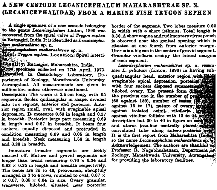 | Type Material | type specimen deposited in the Cestodology Laboratory, Department of Zoology, Marathwada University, Aurangabad, India |