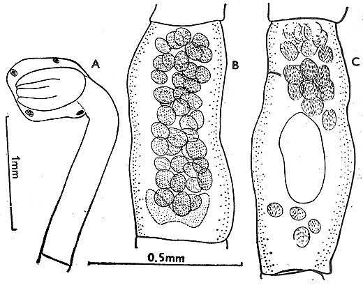 FIGURE 1. Lecanicephalum maharashrtrae n. sp. A. Scolex. B. Mature segment. C. Gravid segment. Scale: 1.0mm applies to A, 0.5mm applies to B and C.
