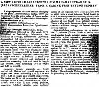 Chincholikar, L. N. and G. B. Shinde. 1978. A new cestode Lecanicephalum maharashtrae sp. n. (Lecanicephalidae) from a marine fish Trygon sephen. Folia Parasitologica 25: 345-346. (140) Download PDF |
