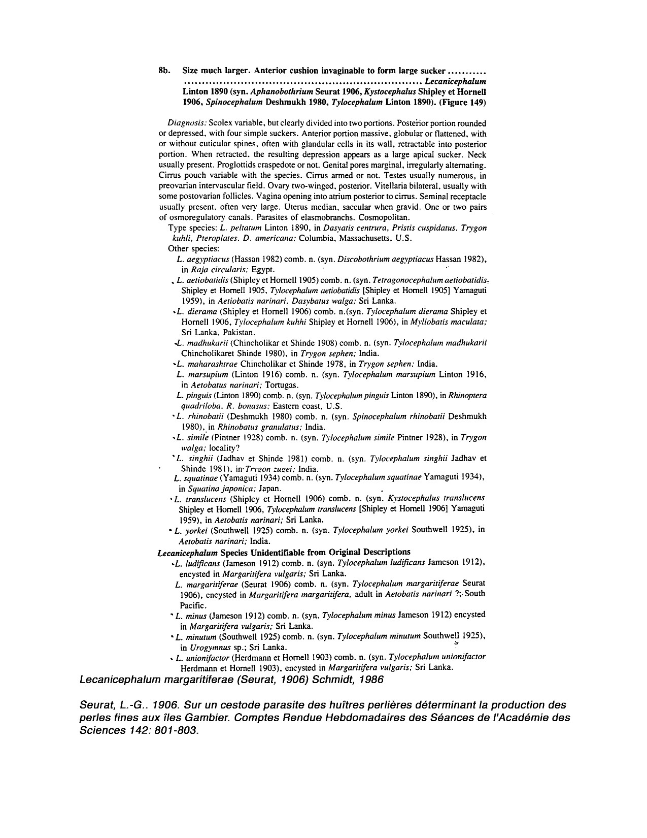 Scientific Name Notes This species was described for specimens identified as lecanicephalidean larvae from pearl oysters. Seurat also described an adult worm from "Aetobatis narinari" which he considered to likely be the adult of these larvae. This species is essentially unrecognizable based on its original description, was not illustrated, and is therefore considered a species inquirenda.