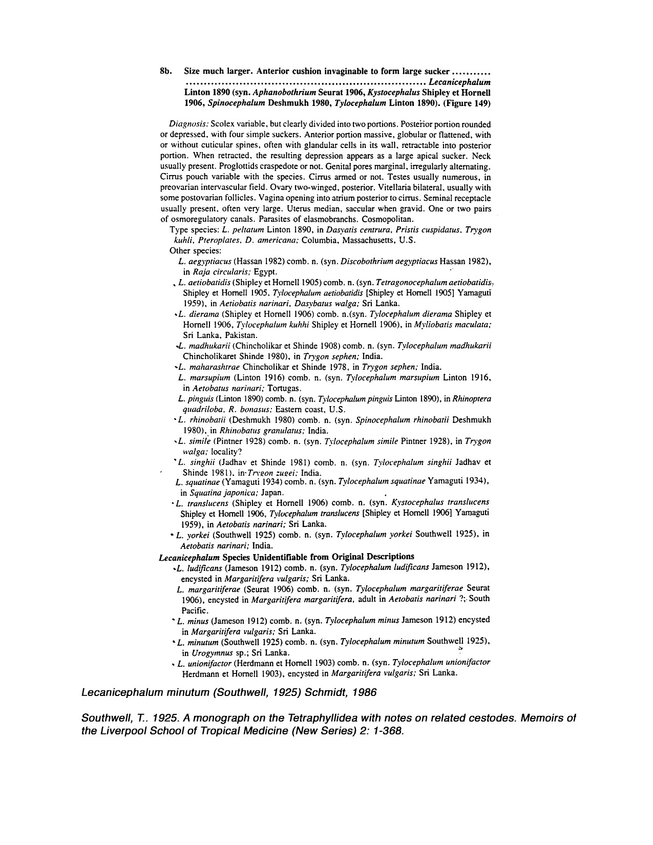 Southwell, T. 1925. A monograph on the Tetraphyllidea with notes on related cestodes. Memoirs of the Liverpool School of Tropical Medicine (New Series) 2: 1-368. (443) Download PDFSchmidt, G. D. 1986. Handbook of tapeworm identification. CRC Press, Boca Raton, Florida, 675 pp. (660) Download PDF |