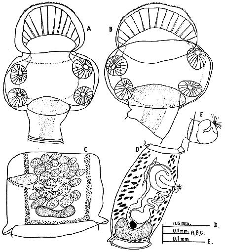 FIGURE 1. Spinocephalum rhinobatii n. sp. A, B. Scolices. C. Mature segment. D. Gravid segment. E. Protruded cirrus armed with spines.