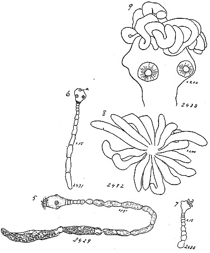 PLATE XV. FIGURES 5-9. Parataenia medusia n. sp. 5. Strobile; outline from living specimen; details of anatomy supplied from an alcoholic specimen, x15. The last two segments are filled with ova. The tentacluar proboscides were everted after the specimen had been placed in alcohol. 6. Outline of strobile, from alcoholic specimen, the tentacular proboscides retracted, x18; a, terminal os into which the proboscides are retracted. 7. Outline of stobile with three of the tentacular proboscides protruding, from alcoholic specimen, x18. 8. Top of head, all the tentacular proboscides extended, making a terminal rosette, or sixteen-rayed crown, from alcoholic specimen, x200. 9. Side view of head showing tentacular proboscides and two of the bothria, from alcoholic specimen, x200. Figures 6-9 by the author, the others by Margaret B. Linton.
