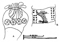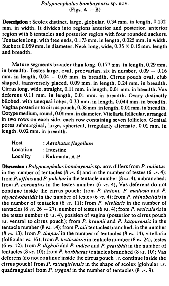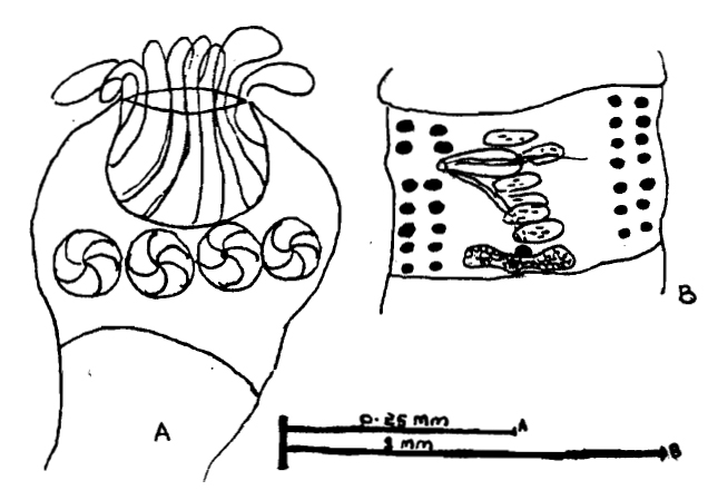FIGURES A & B. Polypocephalus bombayensis n. sp. A. Scolex. B. Mature proglottid.
