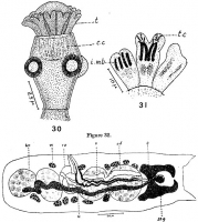 FIGURES 30-32. Polypocephalus coronatus n. sp. 30. Scolex. 31. L.S. of tentacles. 32. Mature segment. Abbreviations: c.c., central cavity; c.p., cirrus pouch; i.m.b., inner muscle bundle of tentacle; o., ovary; sh.g., shell gland; t., tentacle; t.c., tentacular cavity; tes., testes; u., uterus; v., vagina; vi., vitellaria.