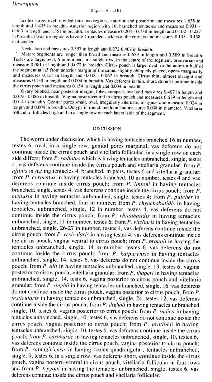 | Scientific Name Notes | This is 1 of 9 species of Polypocephalus described from Rhynchobatus djeddensis from India; it is unlikely that all of these are valid taxa. The description (incl. illustrations) of this species is poor and incomplete, and is based on an unknown number of specimens. The authors neither explicitly fixed a holotype to syntypes, nor included a statement of intent that types will be (or are) deposited in a collection and a statement indicating the name and location of that collection. The lack of access to types renders this species essentially unrecognizable; it is thus considered to be a species inquirenda. |