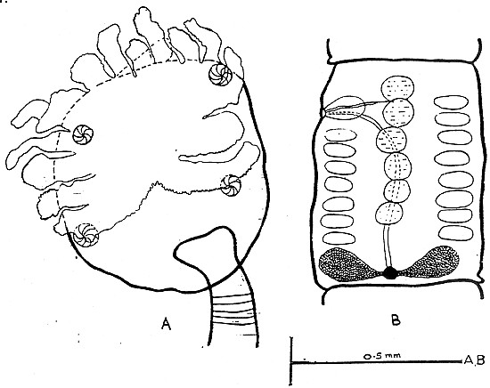 FIGURE 1. Polypocephalus djeddensis n. sp. A. [Scolex]. B. [Mature segment].