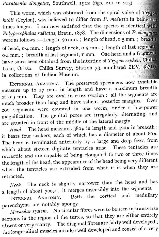 Southwell, T. 1912. A description of ten new species of cestode parasites from marine fishes of Ceylon, with notes on other cestodes from the same region. Ceylon Marine Biological Report 1: 259-278. (438) Download PDFSouthwell, T. 1925. A monograph on the Tetraphyllidea with notes on related cestodes. Memoirs of the Liverpool School of Tropical Medicine (New Series) 2: 1-368. (443) Download PDF |