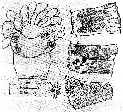 FIGURES A-E. Polypocephalus pratibhae [sic] n. sp. A. Scolex. B. Young segments. C. Mature segment. D. Gravid segment. E. Eggs.