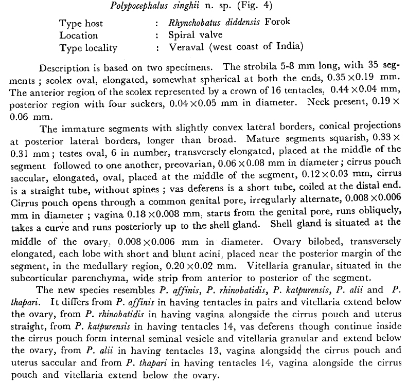 | Scientific Name Notes | This is 1 of 9 species of Polypocephalus described from Rhynchobatus djeddensis from India; it is unlikely that all of these are valid taxa. The description (incl. illustrations) of this species is poor and incomplete, and based on less than a handful of specimens. In addition, the lack of access to types renders this species essentially unrecognizable; it is thus considered to be species inquirenda. |