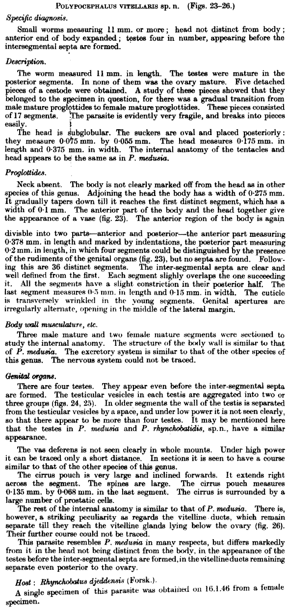 Subhapradha, C. K.. 1951. On the genus Polypocephalus Braun, 1878 (Cestoda), together with descriptions of six new species from Madras. Proceedings of the Zoological Society of London 121: 205-235.