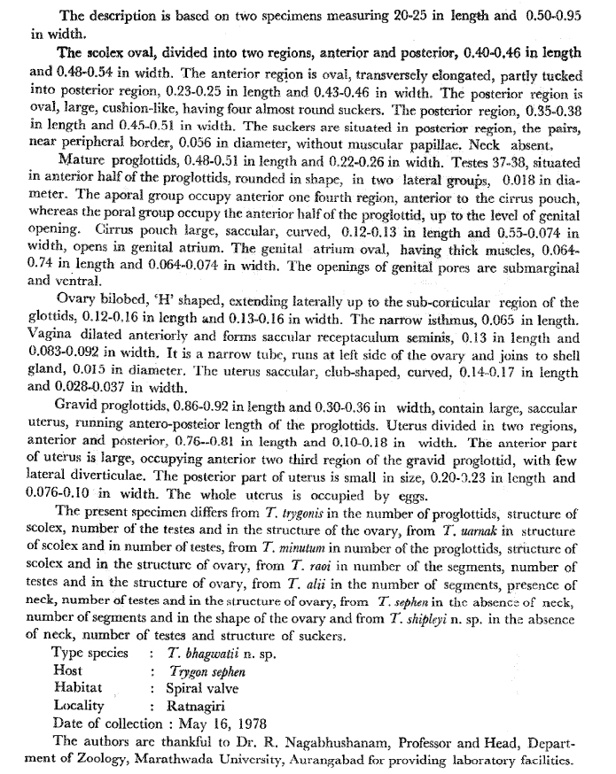 | Scientific Name Notes | The authors neither explicitly fixed a holotype to syntypes, nor included a statement of intent that types will be (or are) deposited in a collection and a statement indicating the name and location of that collection. Thus, type material is essentially NOT available. In addition, this is 1 of several species of Tetragonocephalum described from “Trygon sephen” from India; it is unlikely that all of the species from this host are distinct, diagnosable species. This species is essentially unrecognizable based on its original description. It is therefore considered a species inquirenda. |