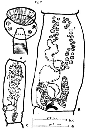 FIGURE 2 A-C. Tetragonocephalum bhagawatii n. sp. A. Scolex. B. Mature segment. C. Gravid segment.