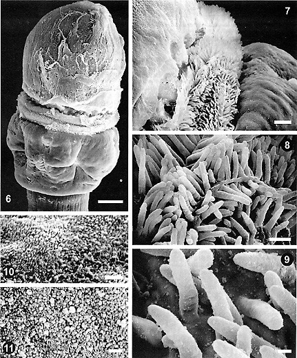 FIGURES 6-11. Tylocephalum brooksi n. sp. 6. Scolex, general view, scale bar = 100 µm. 7. Detail of collar between pars apicalis and pars basalis, note large digitifomr processes, scale bar = 20 µm. 8. Distirbution of microtriches along the collar, scale bar = 5 µm. 9. Details of large digitiform processes covering collar, sclae bar = 1 µm. 10. Short filiform microtriches on pars basalis surface, scale bar = 1 µm. 11. Short filiform microtriches on neck surface, scale bar = 1 µm.