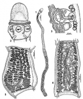 FIGURES 1-5. Tylocephalum brooksi n. sp. 1. Complete worm. 2. Detail of scolex. 3. Detail genetalia terminal, note internal seminal vesicle. 4. Mature segment, ventral view. 5. Mature segment ventral view, note the vulominous external seminal vesicle, becoming larger as segments mature and testes degenerate. Vitellaria are circummedullary in Figure 4 but are only partially drawn to allow the view of internal organs.