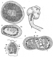 FIGURES 1, 2, 4, 7. Tylocephalum marsupium n. sp. 1. Transverse section of neck. Diameter 0.22mm. 2. Transverse section of early proglottis, showing rudiment of genitalia and peripherally arranged longitudinal muscle bundles. Greater diameter 0.65mm. 4. Transverse section of mature proglottis in front of cirrus bulb; longer diameter 0.45mm. 7. Posterior proglottis; outline from life; genitalia partly diagrammatic. Length 0.8 mm. Abbreviations used: c, retracted cirrus; gp, genital pore; lm, longitudinal muscle bundles; o, ovary; sr, seminal receptacle; t, testes; u, uterus; v, vagina; vg, vitellaria.