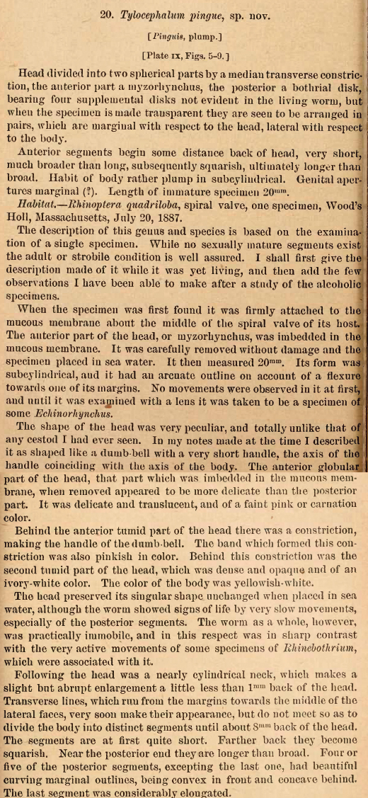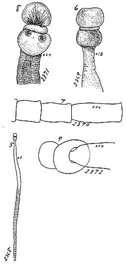 PLATE IX. FIGURES 5-9. Tylocephalum pingue n. gen., n. sp. 5. Outline of living specimen, x 3. Fig. 6. Head and neck of living specimen, x 18. Fig. 7. Outline of posterior segments, x 24. Fig. 8. Head and neck of same individual, when made transparent in oil of cloves, x 24. Fig. 9. Outline of same, showing posterior part of head at its junction with the neck, x 24.