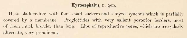 Scientific Name Notes Several aspects of the scolex morphology and proglottid anatomy suggest the type species of this genus to resemble that of several different lecanicephalidean genera and thus should not be considered a synonym of any one at this time. Jensen (2005) considered the genus Kystocephalus to be a genus inquirendum and listed its type species as a species inquirenda.