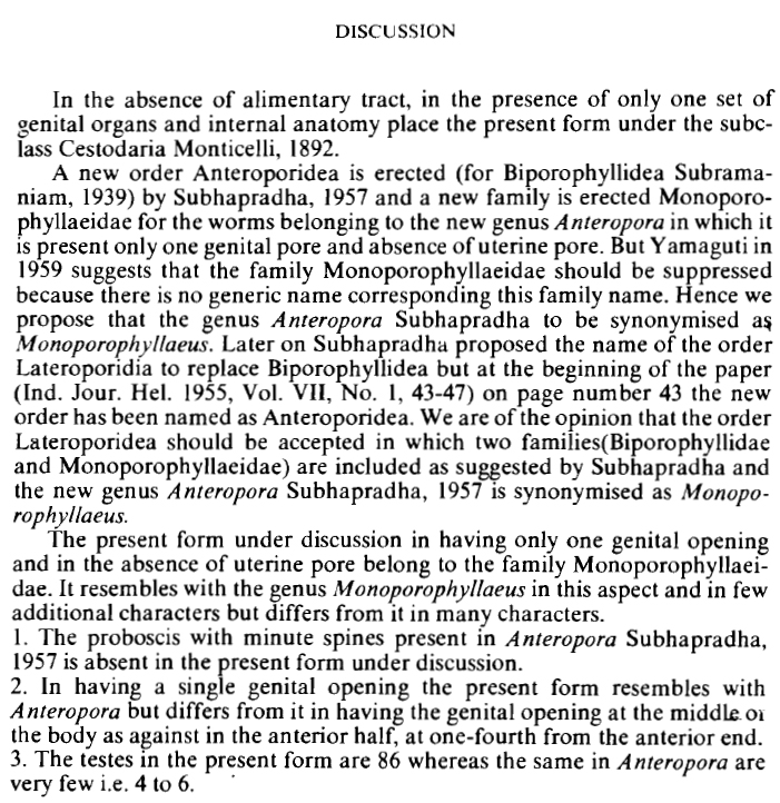| Scientific Name Notes | Shinde & Chincholikar (1977) proposed that “the genus Anteropora Subhapradha to be synonomysed as Monoporophyllaeus.” Jensen, 2005 considered this as an invalid replacement. |