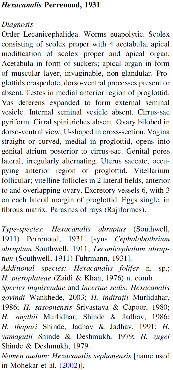 Cielocha, J. J. and K. Jensen. 2011. A revision of Hexacanalis Perrenoud, 1931 (Cestoda: Lecanicephalidea) and description of H. folifer n. sp. from the zonetail butterfly ray Gymnura zonura (Bleeker) (Rajiformes: Gymnuridae). Systematic Parasitology 79: 1–16. (5085) Download PDF |