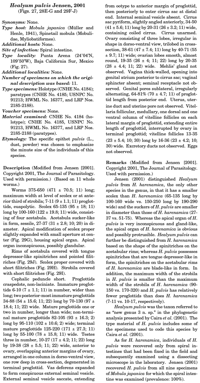 Jensen, K. 2001. Four new genera and five new species of lecanicephalideans (Cestoda: Lecanicephalidea) from elasmobranchs in the Gulf of California, Mexico. Journal of Parasitology 87: 845-861. (3865) Download PDF |